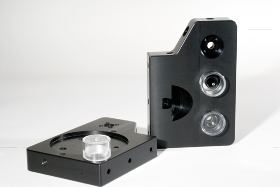 Machined from black Delrin material, the manifold measured 9.063 inches long, 6.125 inches wide, and 1.75 inches high. The manifold also possessed a smooth, 63 RMS finish. The cast acrylic chambers were designed for superior optical clarity and measured 1.750 inch outer diameter, with a .125 inch wall thickness.